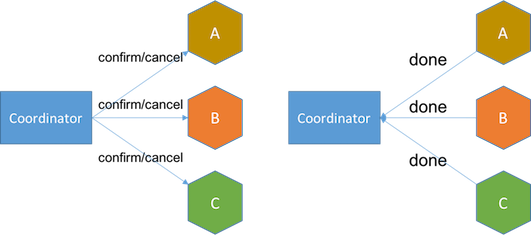 - decision phase if all services say yes, coordinator sends commit message to services and services acknowledge either transaction done or failed. If any service fails to commit, coordinator will initiate additional rounds to abort the transaction.